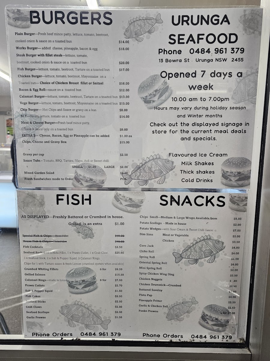 Welcome to Urunga Seafood & Takeaway, where culinary delight meets seaside charm at 13 Bowra St, Urunga NSW. Famous for their classic fish and chips, this gem has been winning hearts with its perfectly crumbled fish and crispy chips that melt in your mouth. Customers rave about the generous portions, with many claiming it's well worth the wait, even during busy times. Their menu boasts a delightful variety of fresh fish options, ensuring there’s something for everyone to enjoy.